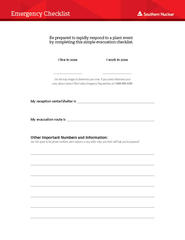 Another way we work to keep you safe is by making sure you know exactly how to respond in the unlikely event of a plant emergency. Please familiarize yourself with Plant Farley's emergency information to ensure you’re prepared to protect yourself and your family. We encourage you to bookmark this page on your mobile device. Use these tools to ensure you know how to react in the event of an emergency. Safety is our first value at Southern Nuclear and your family's safety is our priority.